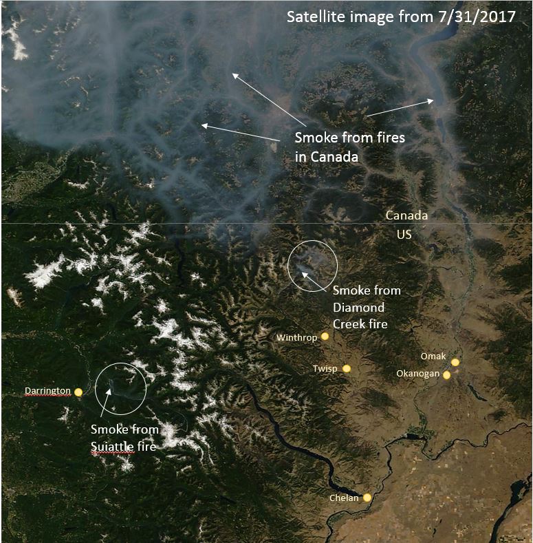 In Washington, the Diamond Creek fire in the Pasayten wilderness has been sending smoke into Winthrop and Twisp for the last week or so but the air quality impacts in Omak and Okanogan are probably due to smoke draining down the Okanogan valley from Canada. A new fire - the Suiattle fire - outside of Darrington is impacting air quality locally.