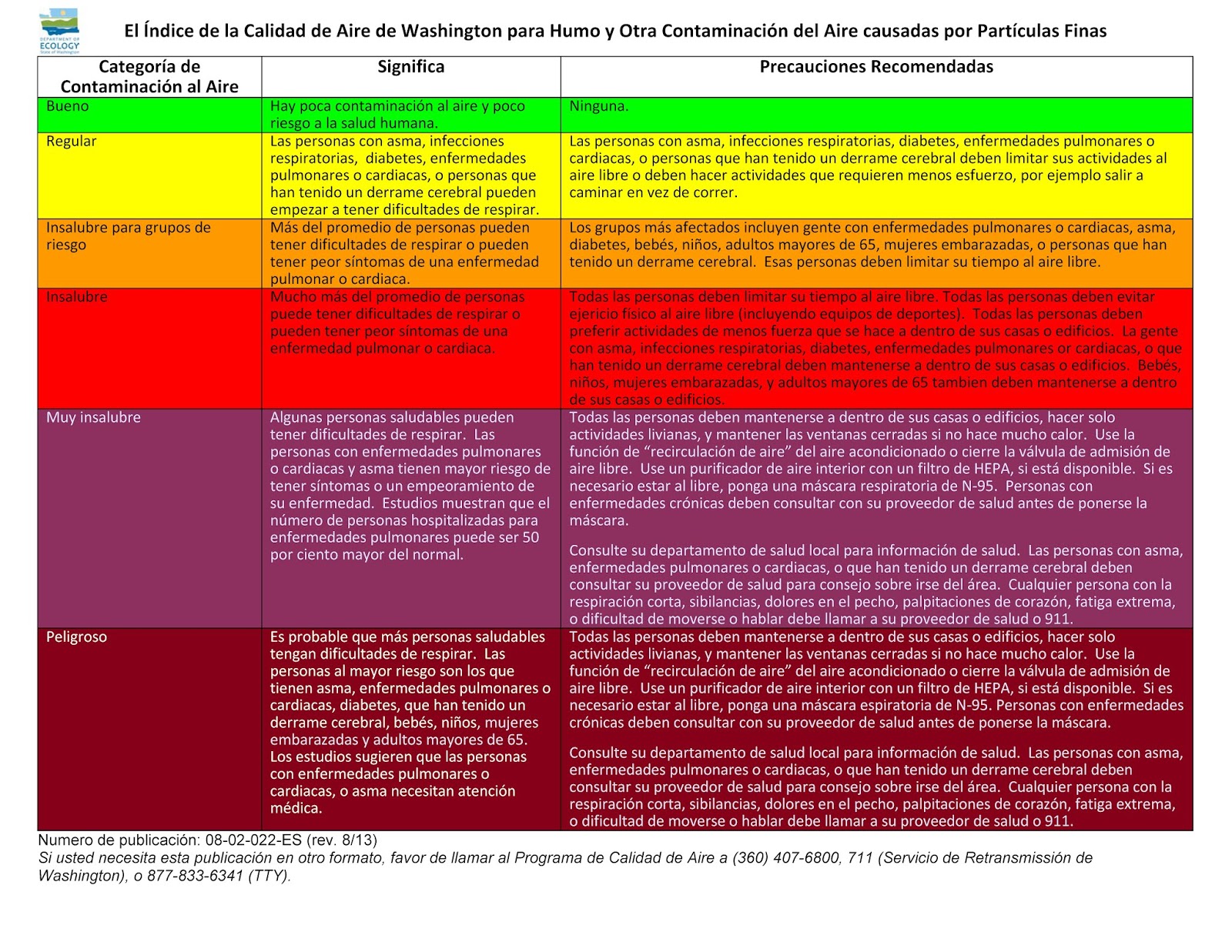 categorías para proporcionar información sobre el nivel de calidad del aire y