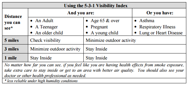 - Between 5-15 miles, air quality is moderate and beginning to deteriorate, and is generally healthy, except possibly for smoke sensitive persons. The general public should avoid prolonged exposure if conditions are smoky to the point where visibility is closer to the 5 mile range.