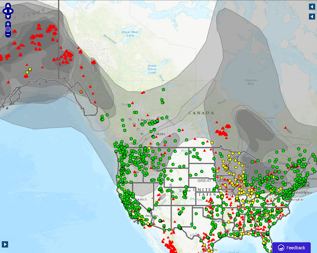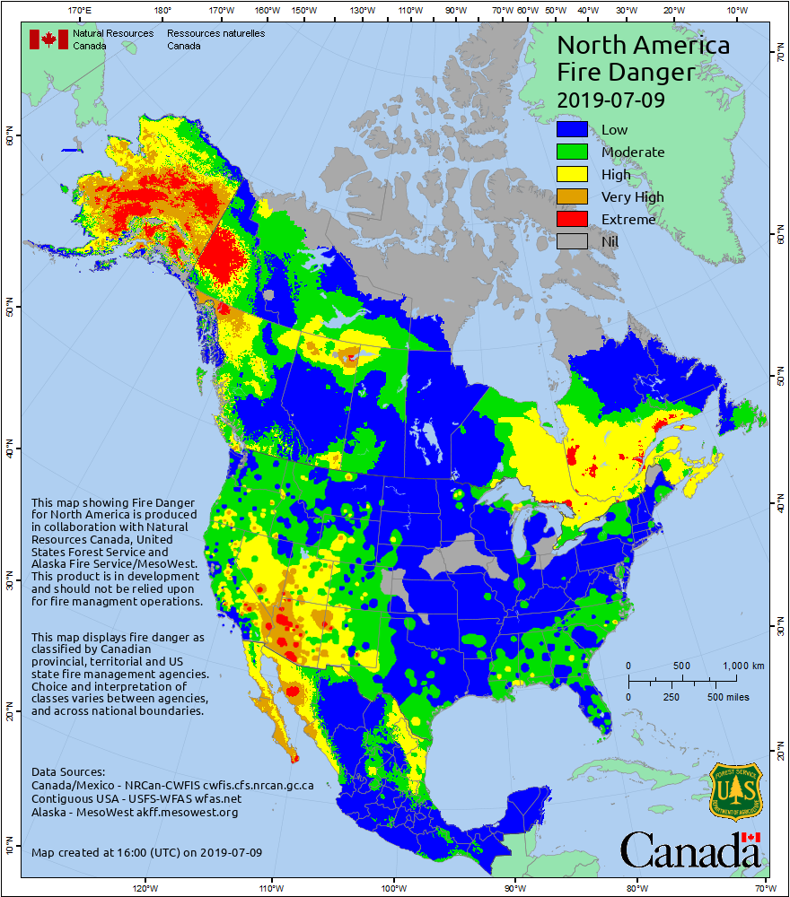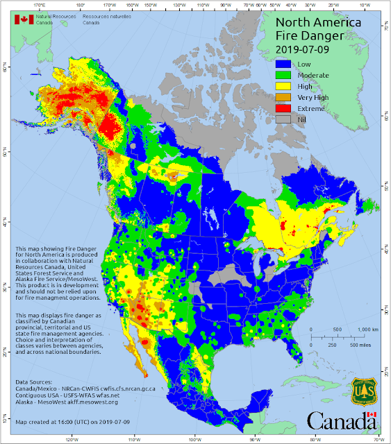 Here's what the fire danger assessment for north America is today. The bigger fires are mostly in Canada & Alaska thanks to very dry & hot conditions to our north.